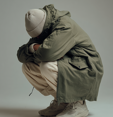 Close-up of a person wearing an olive green hooded jacket and a black knit beanie looking slightly downwards.